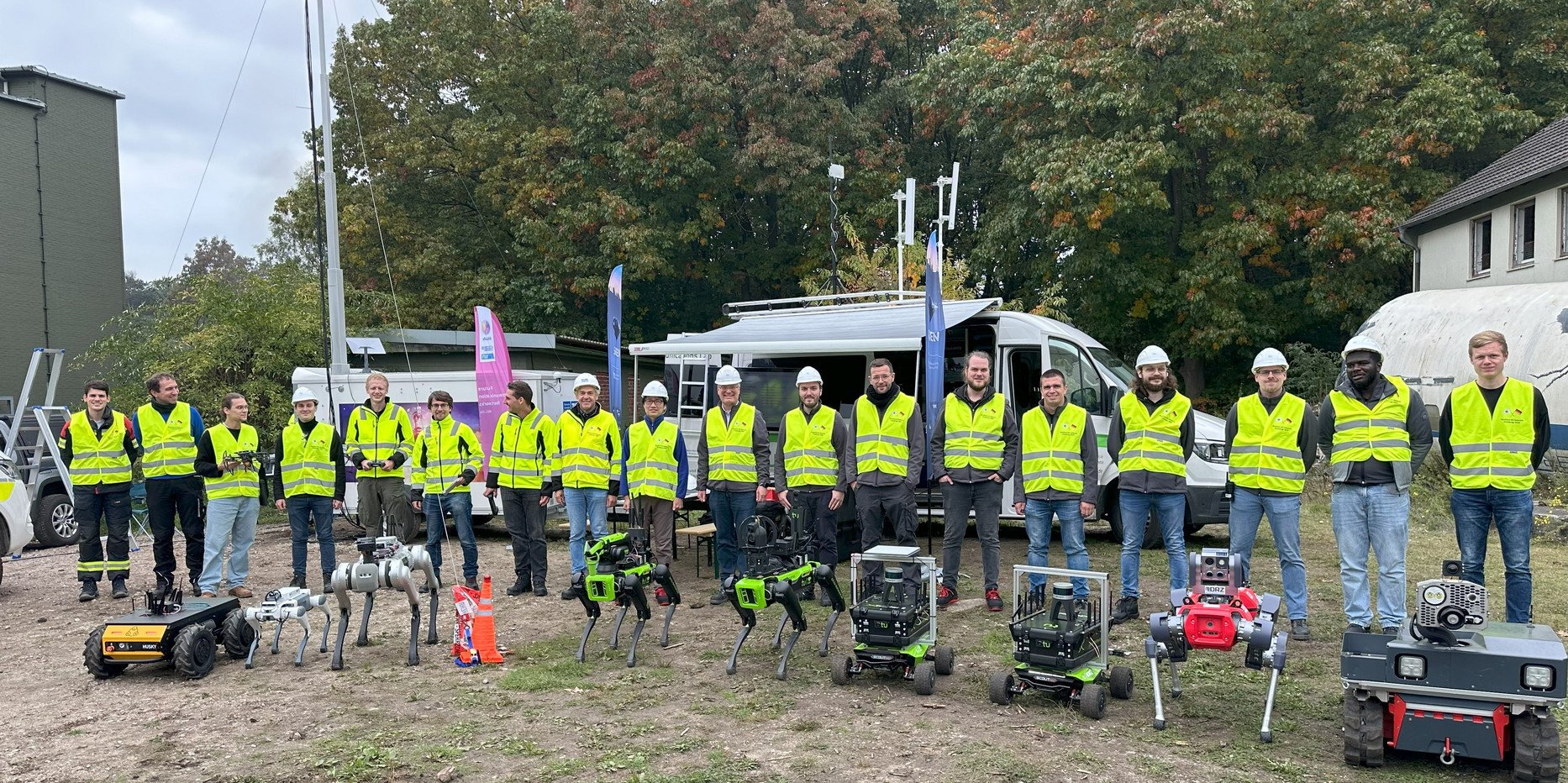 Researchers from 6GEM (TU Dortmund) and 6G-life (TU Munich and TU Dresden) with their rescue robotic fleet and adhoc networking equipment (cellular, mesh and satellite).